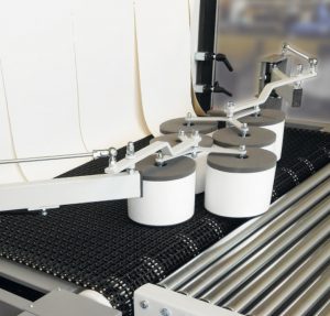 Stazione di avvolgimento prodotto con film di polietilene in termo-retraibile. Le bobine della confezionatrice sono entrambe motorizzate.