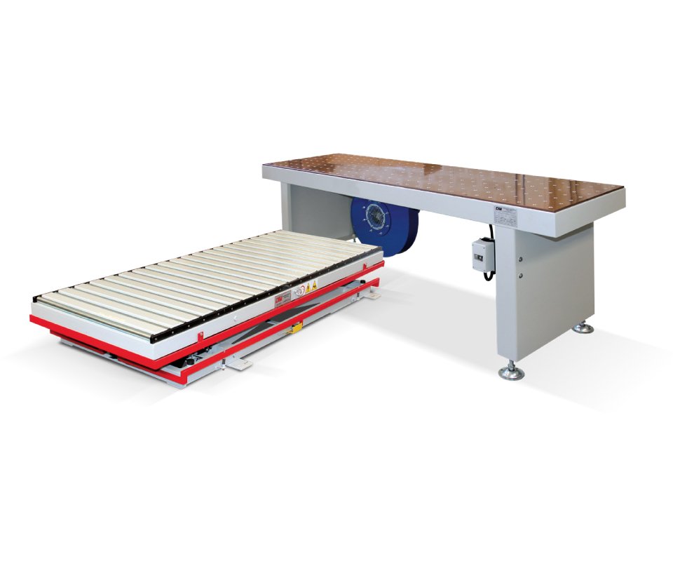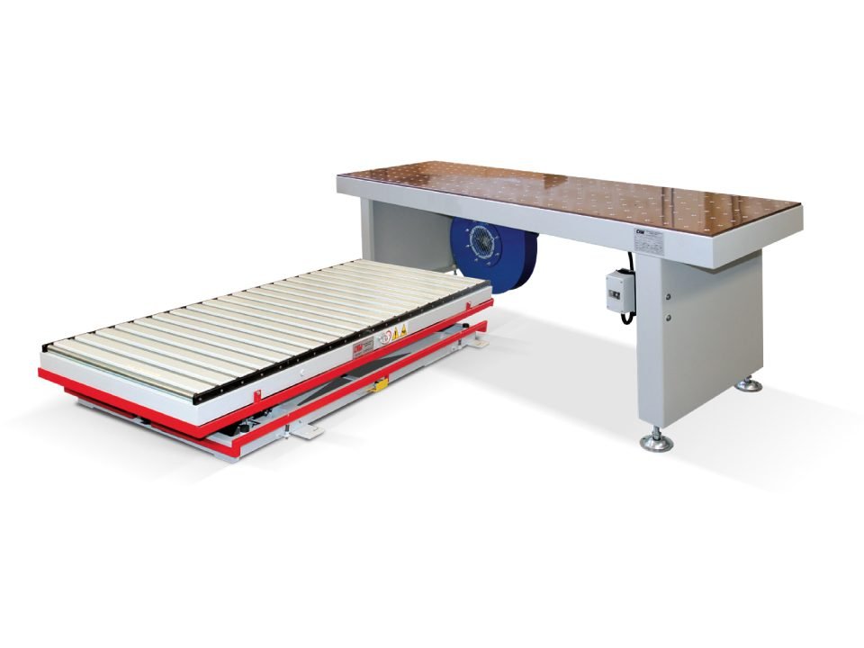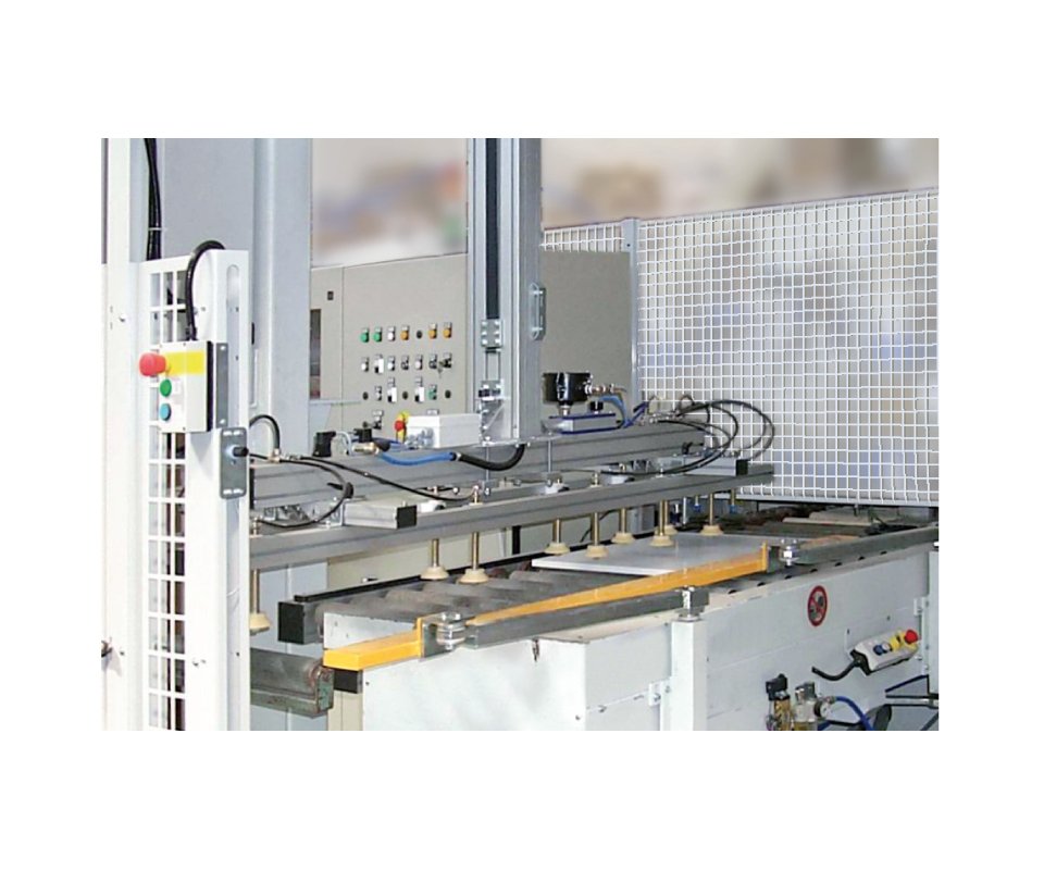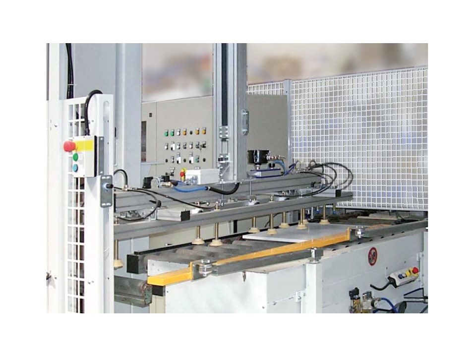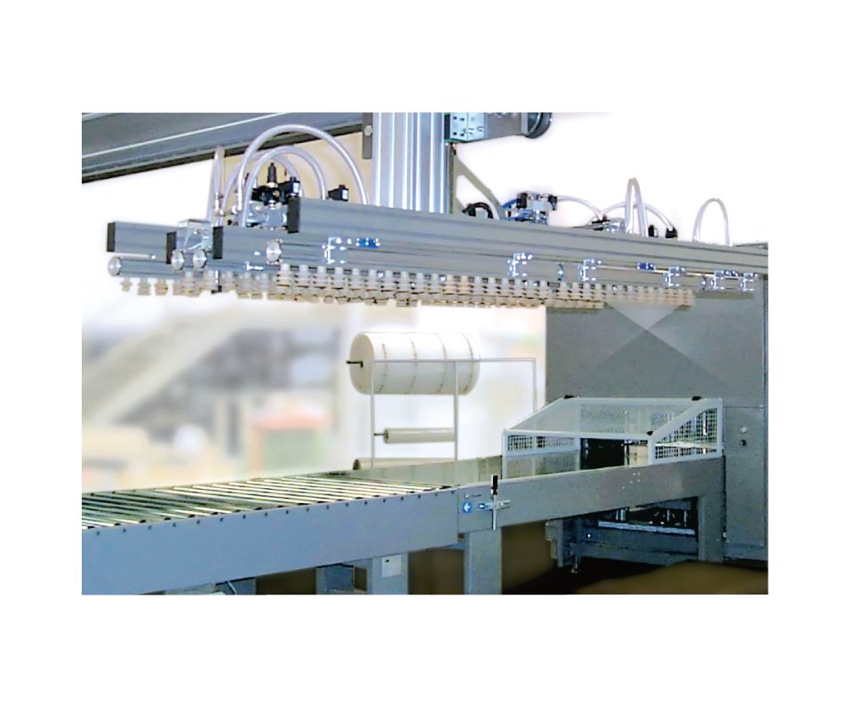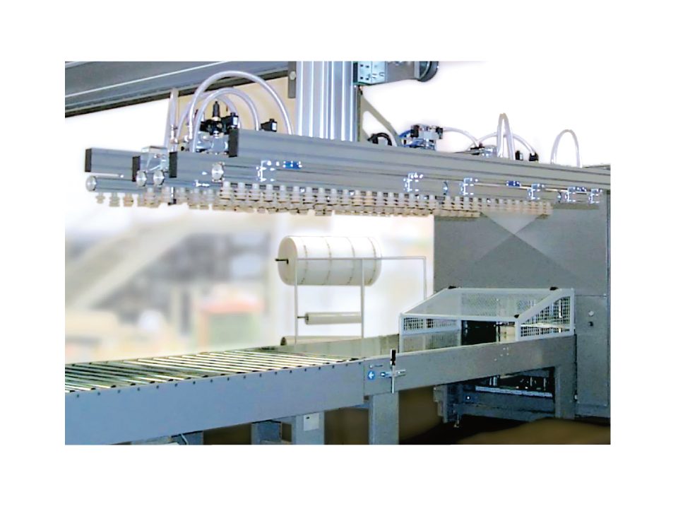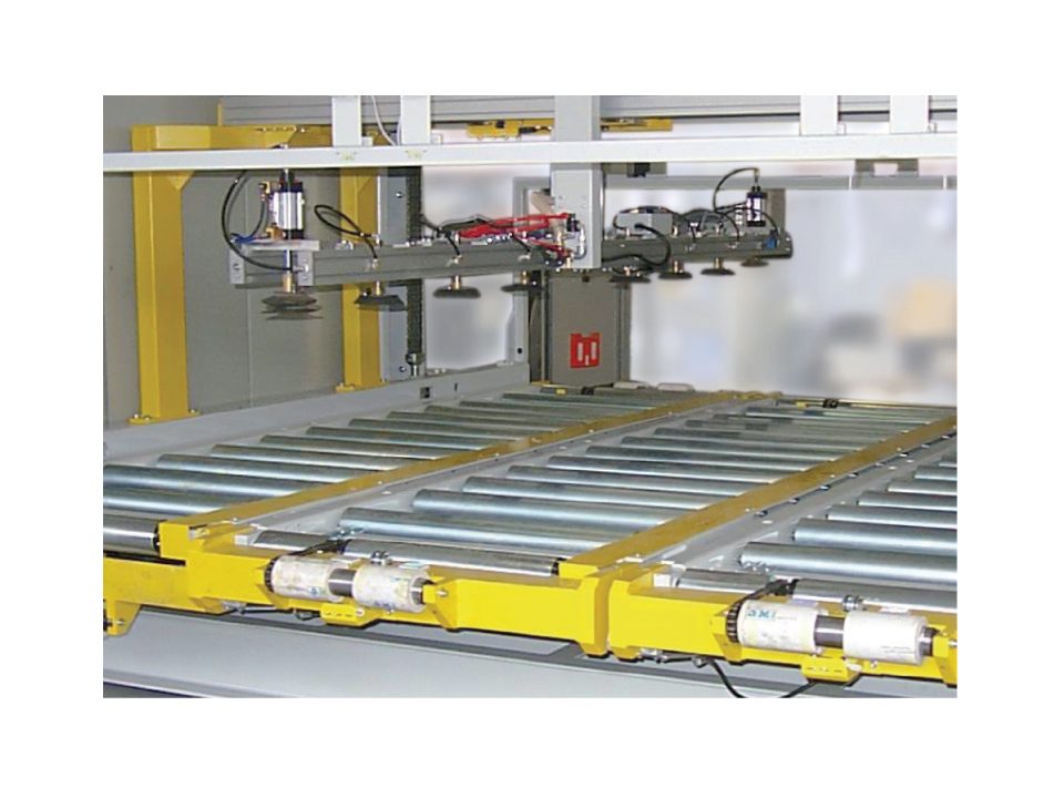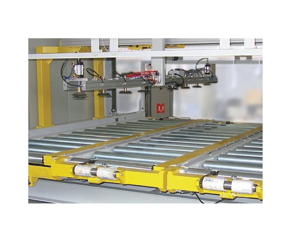 Scaricatore per la palettizzazione di mobili in kit con composizione in fila multipla longitudinale e trasversale.